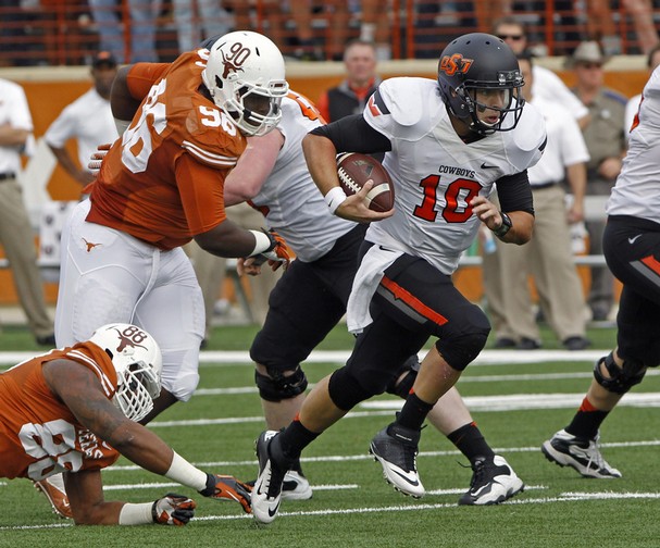 Neither team did much with their first possession, however, on Oklahoma State’s second possession, Chelf began to put pressure on the defense with his legs. The Cowboys drove 72 yards in 7 plays and Chelf had runs of 14, 22 and then an 18 yard touchdown run to put the Cowboys up 7-0. The Longhorns responded by mixing the passing of McCoy and the running of junior Malcolm Brown to drive into Cowboy territory, but had to settle for a 39 yard field goal to cut the Oklahoma State lead to 7-3 going into the 2nd quarter.