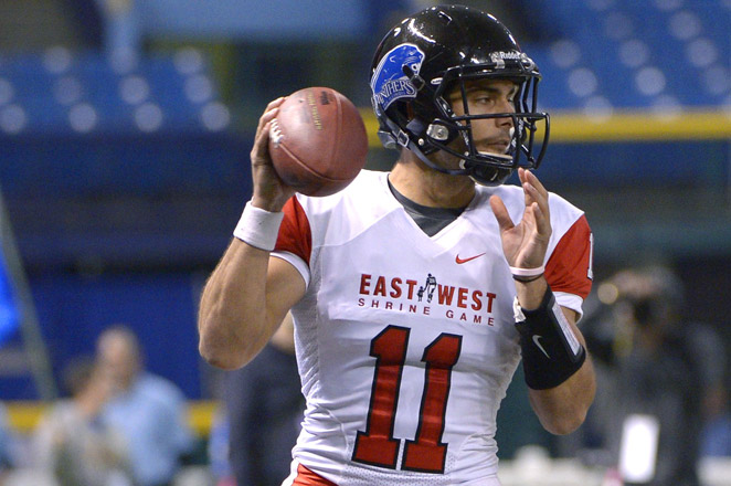 Jimmy Garappolo-QB-Eastern Illinois (6-2 219 lbs.): Prolific senior season at FCS level competition. Quick release. Compact delivery. Good touch. Throws a nice back shoulder ball. Small hands. Had an impressive game. Game MVP and has been invited to the Senior Bowl. Led his team in passing, completing 9 of 14 for 100 yards and 1 TD.