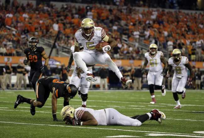Jameis Winston hurdles his way into the end zone as the Florida State Seminoles beat the Oklahoma State Cowboys.